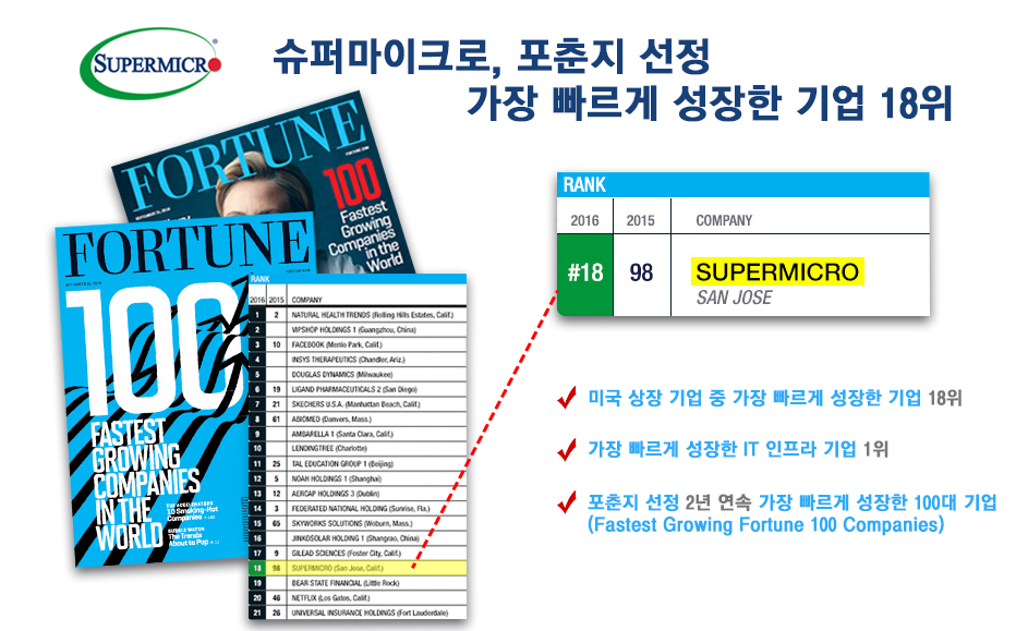 슈퍼마이크로가 포춘지(Fortune) 선정 올해 가장 빠르게 성장한 100대 기업에서 18위에 올랐습니다.