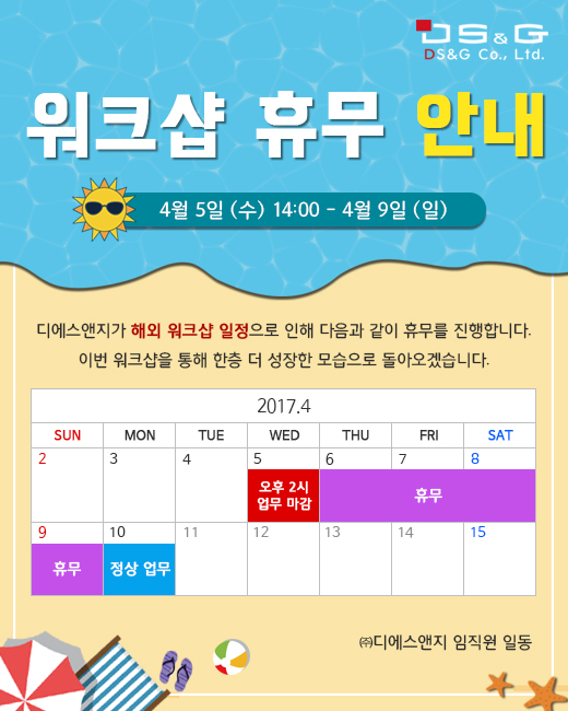 2017 디에스앤지 워크샵 휴무 공지 (4/5 14:00 ~ 4/9)