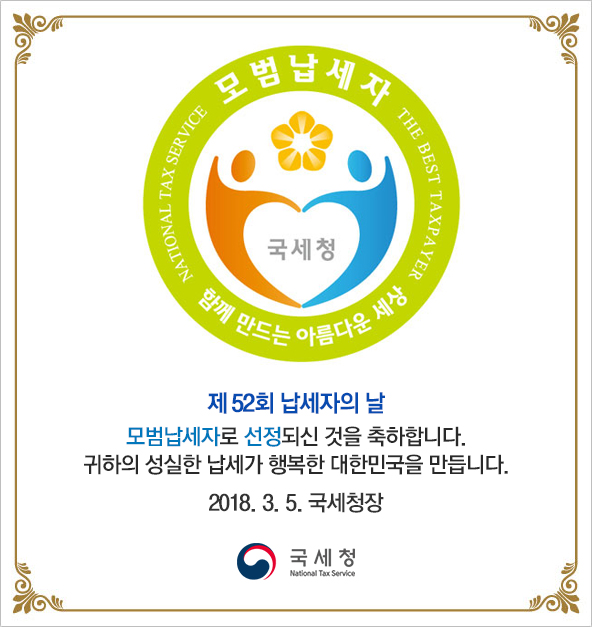 모범납세자로 선정되어 부총리 겸 기획재정부장관상을 수상했습니다.