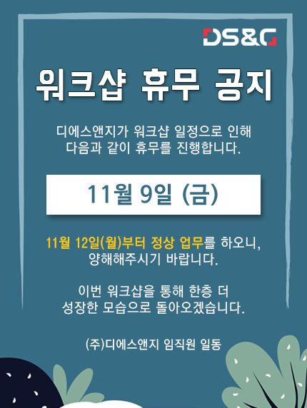 디에스앤지가 워크샵 일정으로 인해 11월 9일 (금) 휴무를 진행하오니, 이 점 양해 부탁 드립니다.
