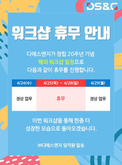 디에스앤지가 창립 20주년 기념 해외 워크샵 일정으로 다음과 같이 휴무를 진행하오니, 이 점 양해 부탁 드립니다.