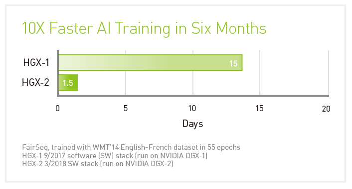 16개 NVIDIA Tesla V100 GPU 및 NVIDIA NVSwitch™로 가속화된 성능을 제공하는 HGX-2는 전례 없는 연산 성능, 밴드위스, 그리고 메모리 토폴로지를 보유하고 있어 더 빠르고 더 효율적으로 거대한 모델을 학습시키고, 데이터셋을 분석하며 시뮬레이션을 해결할 수 있습니다. 실제로 NVIDIA HGX-2 플랫폼은 FP64 및 FP32를 이용하여 과학 연구용 컴퓨팅 및 시뮬레이션에 있어 초정밀 연산을 가능하게 합니다. 또한, FP16 및 INT8을 이용해 딥러닝과 머신러닝 분야에도 초정밀 연산을 지원합니다. 이렇듯 이전에는 찾아볼 수 없었던 범용성은 미래의 컴퓨팅을 지원하는 데 있어 독보적인 위치를 갖게 합니다. 하드웨어, 소프트웨어, 그리고 라이브러리에 걸친 NVIDIA의 stack-to-stack 강화는 단 6개월 만에 AI Training(학습) 속도를 10배 빠르게 가속시켰습니다.