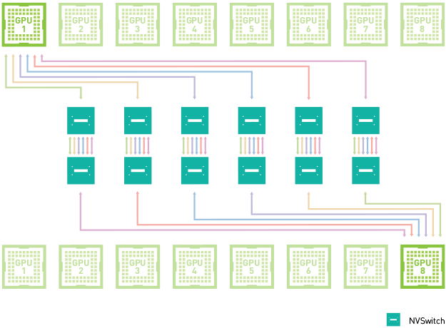 GPU 간의 커넥션을 보여줍니다. 모든 16개 GPU는 동일한 방식으로 NVSwtich™에