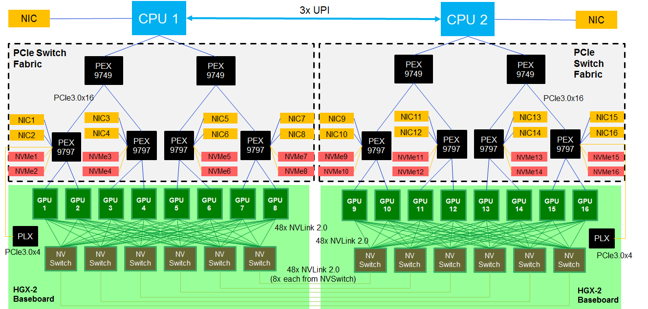 GPU, CPU, NIC 그리고 NVMe 드라이브는 모두 PCIe 3.0 스위치 컴플렉스를 통해 연결되어, 시스템 상의 장치들