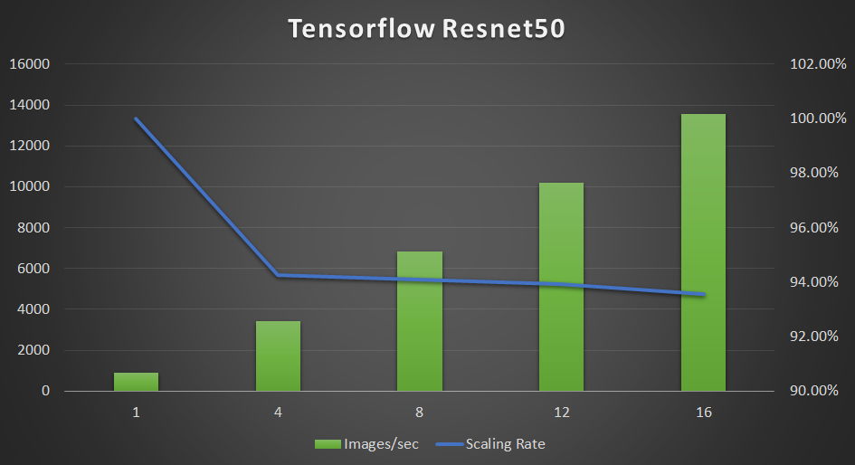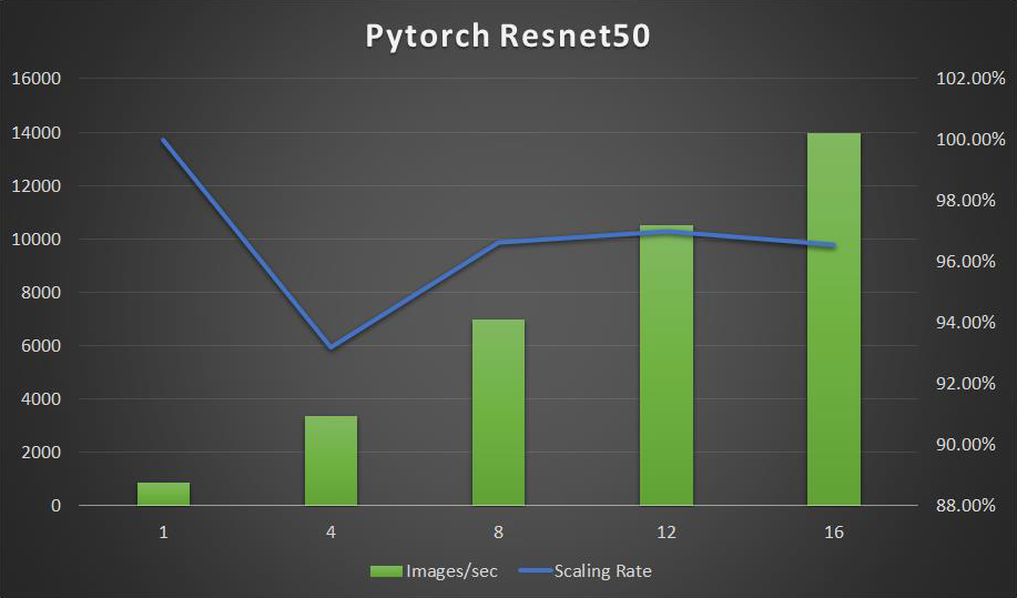 대규모 데이터센터 클러스터 내에서 다수의 노드로 확장 시, 모든 GPU는 Mellanox Infiniband, EDR NIC를 통해 low latency로 다른 노드의 GPU와 직접 커뮤니케이션 가능합니다. 이는 대량의 병렬 클러스터에서 운영체제를 포함하지 않고 하나의 컴퓨터 메모리에서 다른 컴퓨터 메모리로 DMA하는 RDMA (Remote Direct Memory Access) 기술을 통해 가능합니다. RDMA는 네트워크 내의 다른 서버의 메모리에 직접 접속하여 데이터를 교환 및 사용하는 기술로 높은 throughput과 low latency 네트워킹을 수행합니다.