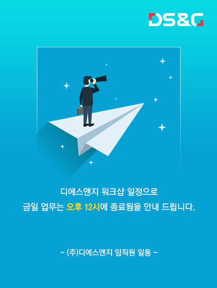 디에스앤지 워크샵 일정으로 금일 업무는 오후 12시에 종료됨을 안내 드립니다.