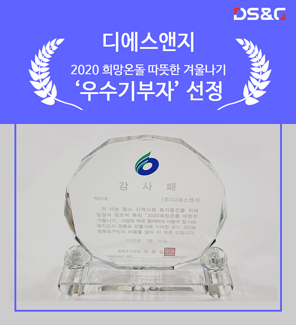 디에스앤지가 영등포구청 ‘2020 희망온돌 따뜻한 겨울나기’의 우수기부자로 선정되었습니다.
