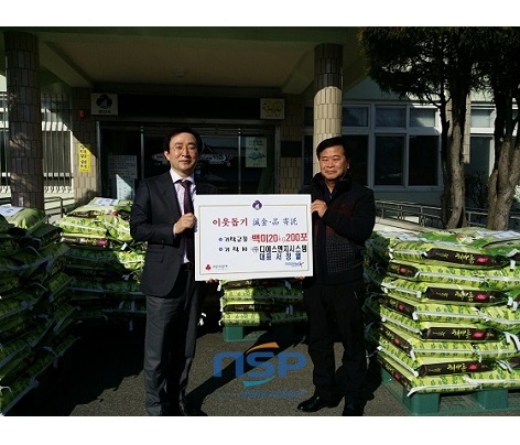 2014년 12월 10일 NSP통신 ㈜디에스앤지시스템 서정열 대표이사(왼쪽)가 9일 군산시 개정면사무소를 방문해 전금철 개정면장(오른쪽)에게 취약계층 및 경로당 등에 전달해 달라며 사랑의 쌀(20kg) 200포(850만원 상당)를 기탁하고 있다. (전북=NSP통신 김광석 기자) = 디에스앤지시스템(대표 서정열)은 9일 군산시 개정면사무소를 방문, 사랑의 쌀(20kg) 200포(850만원 상당)를 기탁했다. 이날 기부한 사랑의 쌀은 지역 내 저소득 독거노인과 장애인, 취약계층, 경로당 25개소 등 200여 가구에 전달할 예정이다. 서정열 대표는 "이번 사랑의 쌀 기부는 연말을 맞아 고향인 개정면의 어려운 이웃들에게 조금이나마 도움이 됐으면 한다"며 "행복을 나누는 활동을 함께 할 수 있어 기쁘고 앞으로도 지속적으로 나눔을 실천하겠다"고 전했다. 전금철 개정면장은 "경기침체로 어려운 시기에 고향을 찾아 도움을 주신 ㈜디에스앤지시스템의 사회공헌 활동에 감사하다"며 "앞으로도 소외되고 어려운 복지사각 지대에 있는 취약계층을 꾸준히 발굴해 살기 좋은 개정면을 만들 계획"이라고 말했다. nspks@nspna.com, 김광석 기자(NSP통신)< 저작권자ⓒ 한국의 경제뉴스통신사 NSP통신. 무단전재-재배포 금지.>