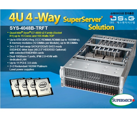 2014년 3월 5일 전자신문 미국 슈퍼마이크로 컴퓨터사의 한국 총판인 ㈜디에스앤지시스템(대표이사 서정열)은 x86 계열 서버 프로세서 중 최상위에 위치한 인텔 제온 E7 v2 시리즈를 지원하는 서버 IR4048B-TRFT를 출시했다. 이 시스템은 최신 인텔 제온(Intel(R) Xeon(R)) 프로세서 E7-8800/4800v2를 지원하고, 155와트 T에 최대 성능 프로세서를 위한 듀얼-존 쿨링과 같은 혁신적인 아키텍쳐를 제공한다. 또한 IPMI2.0 원격 모니터링과 풍부한 (2+2) 1620watt 핫-스왑 가능한 플래티넘 레벨의 고효율 전력 공급하고, 듀얼 10GBase-T 포트들과 전용 1 x LAN포트, 최대 6TB DDR3 1600MHz Reg. ECC R/LRDIMMs을 지원하는 96x DIMM슬롯, 최대 48x 2.5' 핫-스왑 HDD/SSD103, 초당 12기가비트(Gb/s) SAS3 백플레인, 11x PCI-E 3.0 슬롯을 제공한다. 고용량 메모리와 유연한 I/O확장이 가능한 해당 플랫폼은 데이터 센터, 가상화 및 중요 업무를 수행하는 기업 애플리케이션의 구축에 최적화 돼 있다. 슈퍼마이크로는 고객에게 최상의 구축 시간을 제공하기 위해 배송전 메모리, 추가 부품과 CPU를 검사하고 유효성을 입증한 후 완벽한 솔루션으로 판매할 예정이다. 3월 한 달간 디에스앤지시스템 서버 전문가의 상담을 통해 구매한 고객 중 추첨을 통해 제주항공권 2매(50만원 상당)를 증정할 예정이다. 보다 자세한 사항은 홈페이지(www.dsngsystem.co.kr)를 통해 확인할 수 있다. 온라인뉴스팀