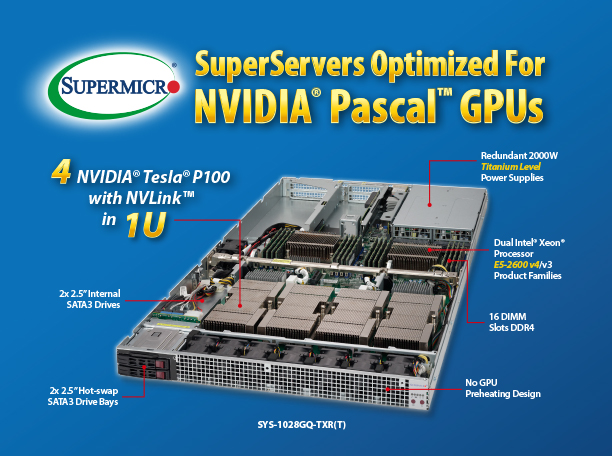 엔비디아는 ‘테슬라 P100’을 기존 PCI-E 방식과 보드의 GPU 전용 소켓에 직접 장착하는 ‘SXM2’ 방식등 크게 2가지 타입으로 선보였는데, 슈퍼마이크로는 ‘파스칼’ GPU의 성능을 극대화하는 동시에 다수의 ‘파스칼’ GPU 노드로 확장이 가능한 전용 시스템을 총 3가지 모델로 출시했다.