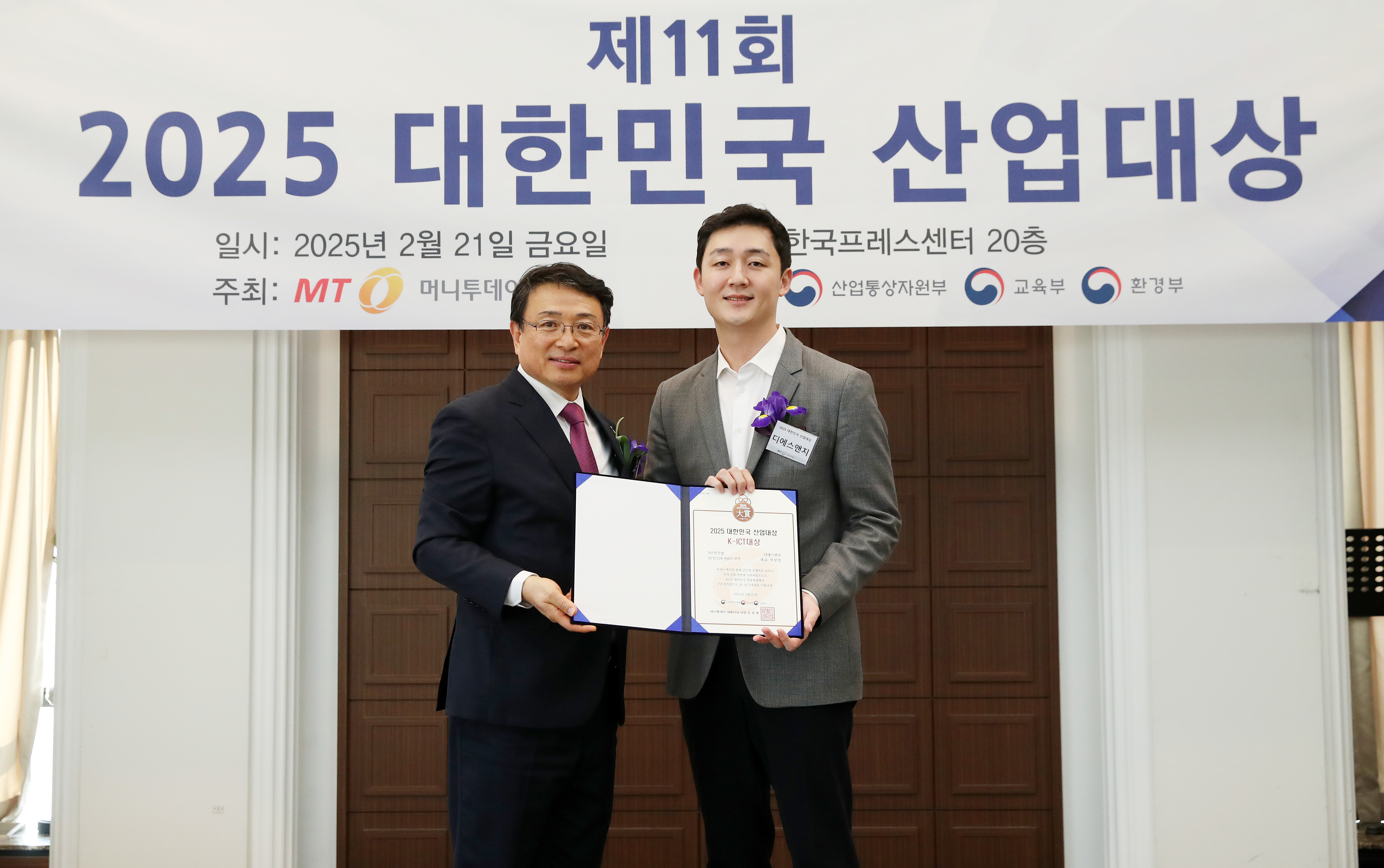 서영민 디에스앤지 전무(사진 오른쪽)가 21일 오후 서울 중구 한국프레스센터에서 열린 머니투데이 주최의 '2025 제11회 대한민국 산업대상' 시상식에서 2년 연속상으로 'AI 인프라 서비스' 부문 'K-ICT대상'을 수상하고 이종섭 동국대학교 교수와 기념사진을 촬영 중이다.