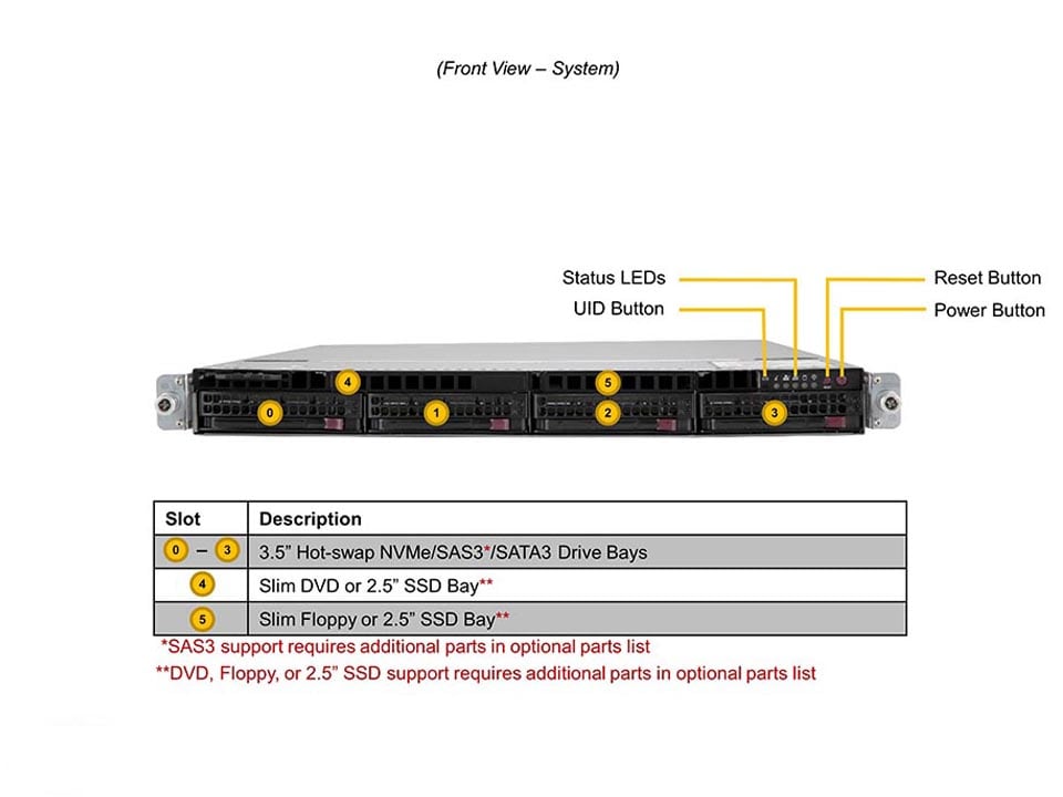 | Optional Storage Controller Card + Cable(s) | AOC-S3008L-L8E + 1x CBL-SAST-0948 • | - | Standard LP, 8 internal ports (12Gb/s) Gen-3; HBA |