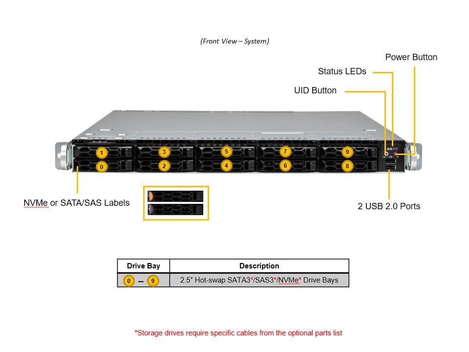 | NVMe Cables Kit | CBL-KIT-121C-TN10R-10 | 1 | Supports 10 NVMe drives. Kit includes: 4x CBL-MCIO-1214M5FY (NVMe drive slots # 0-3, 6-9) 1x CBL-MCIO-1234M5FRE (NVMe drive slots # 4-5) |