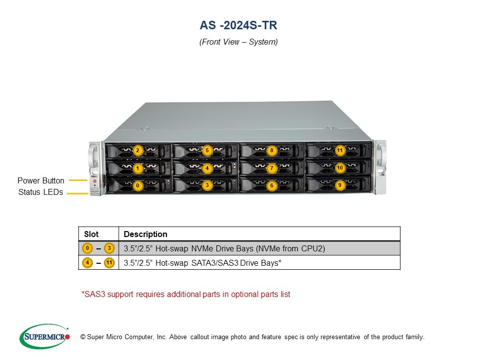 Key Features Virtualization Hyperconverge Storage Cloud Computing High End Enterprise Server Flexible Networking Options 1. Dual AMD EPYC™ 7001/7002* Series Processors (*AMD EPYC 7002 series drop-in support requires board revision 2.x) 2. 4TB Registered ECC DDR4 2666MHz SDRAM in 32 DIMMs (7001 Processors) 8TB Registered ECC DDR4 3200MHz SDRAM in 32 DIMMs (Board revision 2.x required + 7002 Processors) 3. Expansion slots: 1 PCI-E 3.0 x16 slot (FH, 10.5" L) 5 PCI-E 3.0 x8 slots (FH, 9.5" L) 1 PCI-E 3.0 x8 slot (LP) 1 PCI-E 3.0 x8 (internal proprietary LP slot) [ Details ] 4. Integrated IPMI 2.0 + KVM with dedicated LAN • Software Out of Band License key (SFT-OOB-LIC) included for OOB BIOS management 5. Quad Gigabit LAN ports via Intel i350AM4 6. 12 hot-swap 3.5" Drive Bays: 12 SATA3 by default or 8 SATA3 + 4 NVMe (optional supported) or 12 SAS3 (SAS Add-on card is optional) 7. 1600W Redundant Power Supplies Titanium Level (96%+) (Full redundancy based on configuration and application load) |