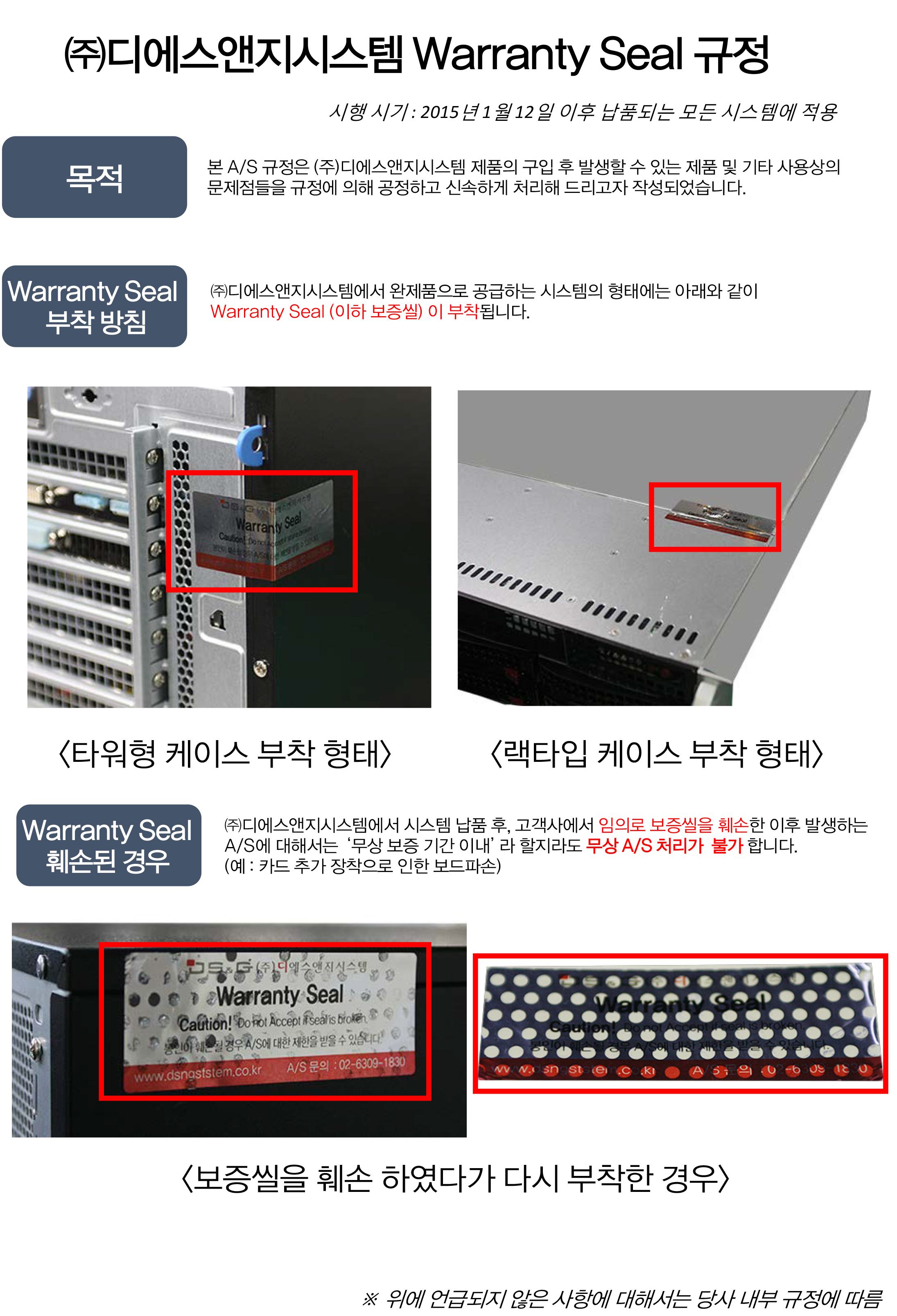 (주)디에스앤지시스템은 2015년 1월 12일 부로 아래와 같은 Warranty Seal 정책을 시행함을 안내 드립니다.