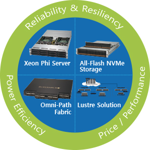 아래 이미지는 인텔에서 제시한 크게 HPC 아키텍처의 4가지 파트(컴퓨트 / 메모리&스토리지 / 패브릭 / 소프트웨어)입니다. 컴퓨트(연산)의 경우 서버용 프로세서 시장을 주도하고 있는 Xeon(제온) 프로세서가 대표적이며, 올해 출시된 인텔 제온 파이 Knights Landing (나이츠 랜딩)도 이에 해당됩니다. 이외에도 Infiniband EDR의 대항마로서 선보인 100Gbps의 Omni-Path (옴니패스) 패브릭이나 NVMe(Non-volatile Memory Express; 비휘발성 메모리) SSD 역시 HPC 분야를 타깃으로 하고 있습니다.