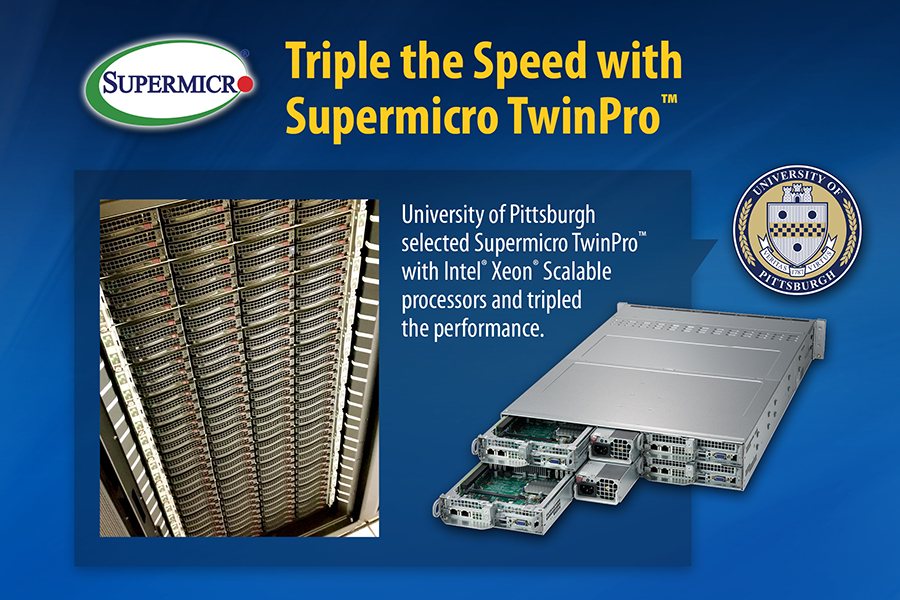 미국 피츠버그 대학(University of Pittsburgh)의 리서치 컴퓨팅 센터는 100개의 슈퍼마이크로 랙 통합형 TwinPro 노드를 사용하여 3배 더 빠른 성능을 보였습니다. 이는 12-코어, 2.6GHz의 Intel® Xeon® 확장형 프로세서, 192GB 메모리 및 NVMe 스토리지를 탑재했습니다. 피츠버그 대학은 최신 Intel® Xeon® 확장형 프로세서를 사용하여 컴퓨터 클러스터를 구축한 최초 기관 중 하나입니다.