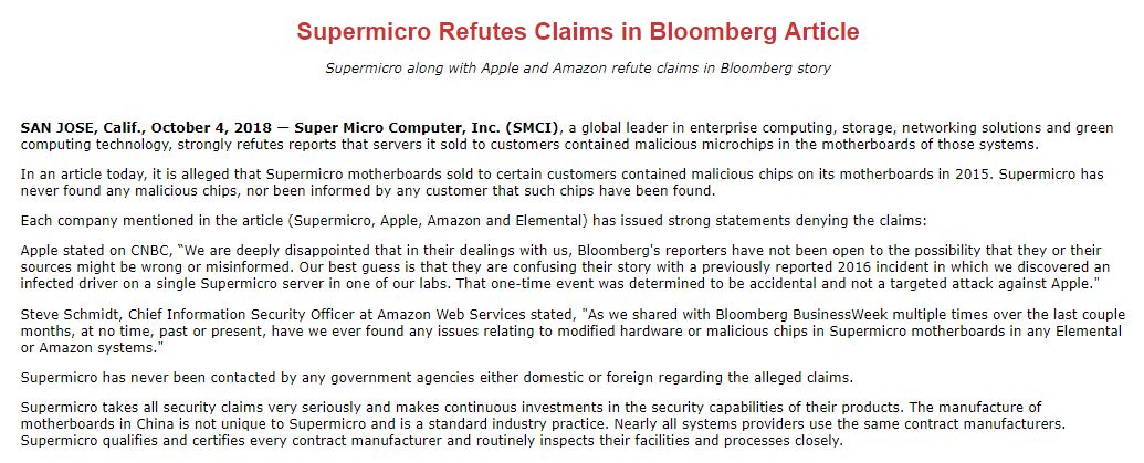 현재 슈퍼마이크로는 애플, 아마존과 함께 블룸버그 기사에 언급된 내용을 반박한 상태입니다.