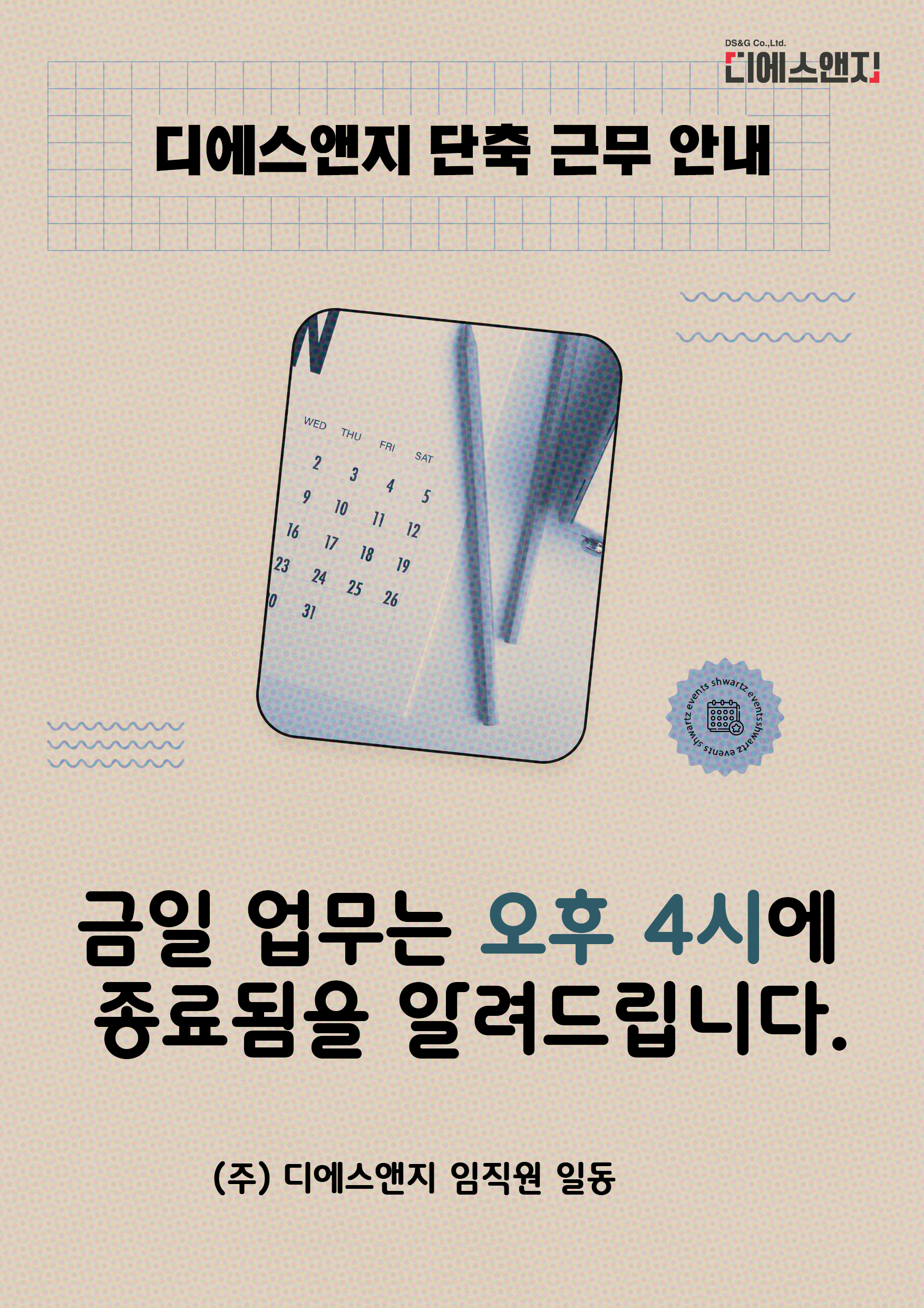 (주)디에스앤지시스템은 관련 법령 및 ㅎ쇠사 정책에 의해 내용의 추가, 삭제, 정정이 있을 시 시행 7일 전부터 변경사항을 홈페이지를 통하여 고지할 것입니다.