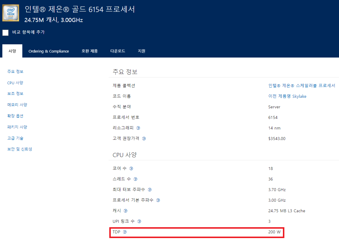 *제온 골드 6154의 최대 TDP는 200W 입니다.