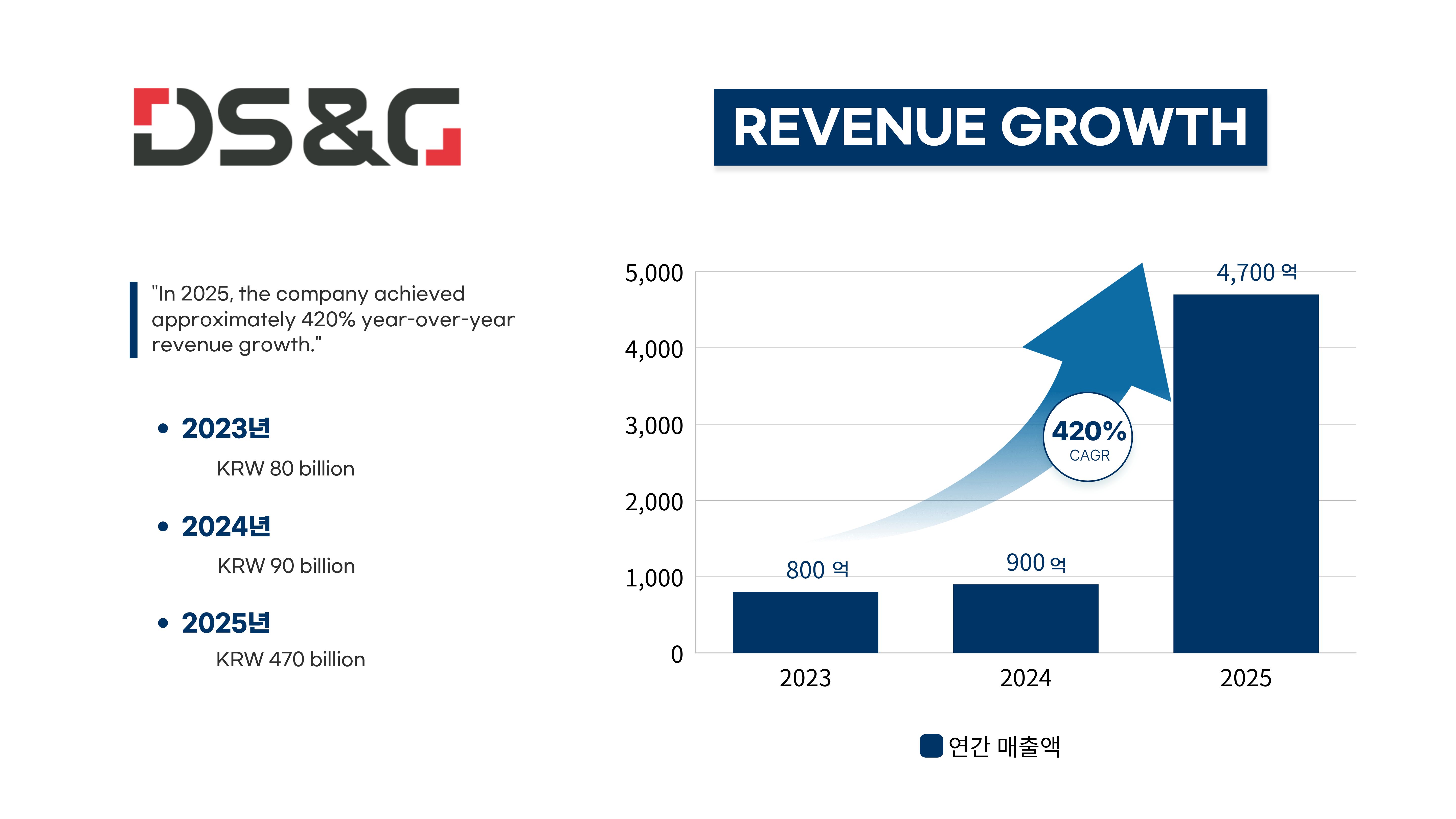 AI 인프라 전문 기업 디에스앤지(DS&G, 대표 서정열)가 2025년 결산에서 전년 대비 420%라는 경이로운 성장률을 기록했다. 2024년 900억 원 매출에서 1년 만인 2025년에 4700억 원의 매출을 달성, 연매출 5000억 원 클럽 가입을 눈앞에 뒀다. 회사는 "국내 대표 CSP의 대규모 사업 수주와 공공 시장 성공적 진출이라는 양대 성과를 통해 기술력과 시장 지배력을 동시에 입증했다"고 밝혔다.