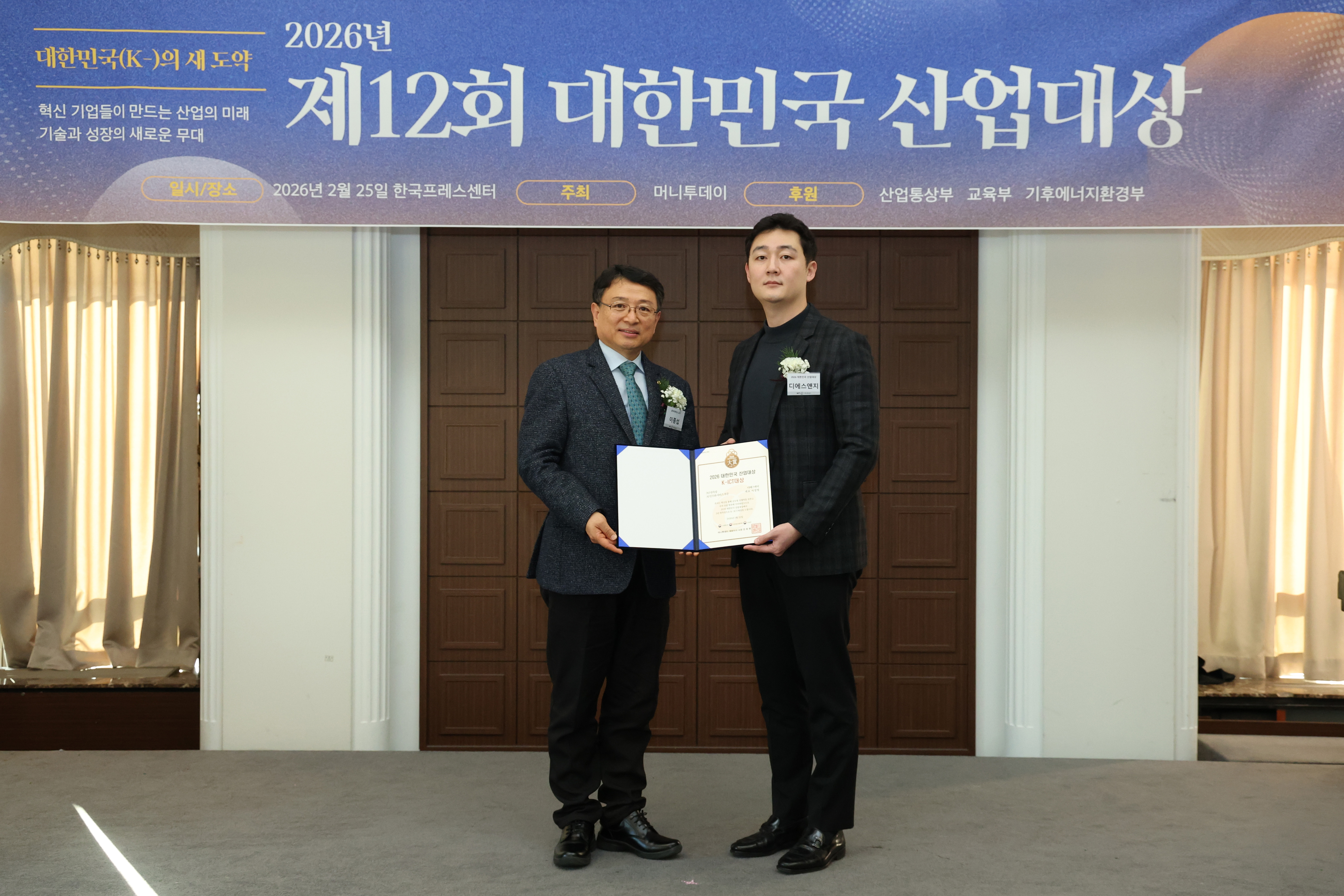서영민 디에스앤지 전무(사진 오른쪽)가 25일 오후 서울 중구 한국프레스센터에서 열린 머니투데이 주최의 '2026 제12회 대한민국 산업대상' 시상식에서 3년 연속상으로 'AI 인프라 서비스' 부문 'K-ICT대상'을 수상하고 이종섭 동국대학교 교수와 기념사진을 촬영 중이다.