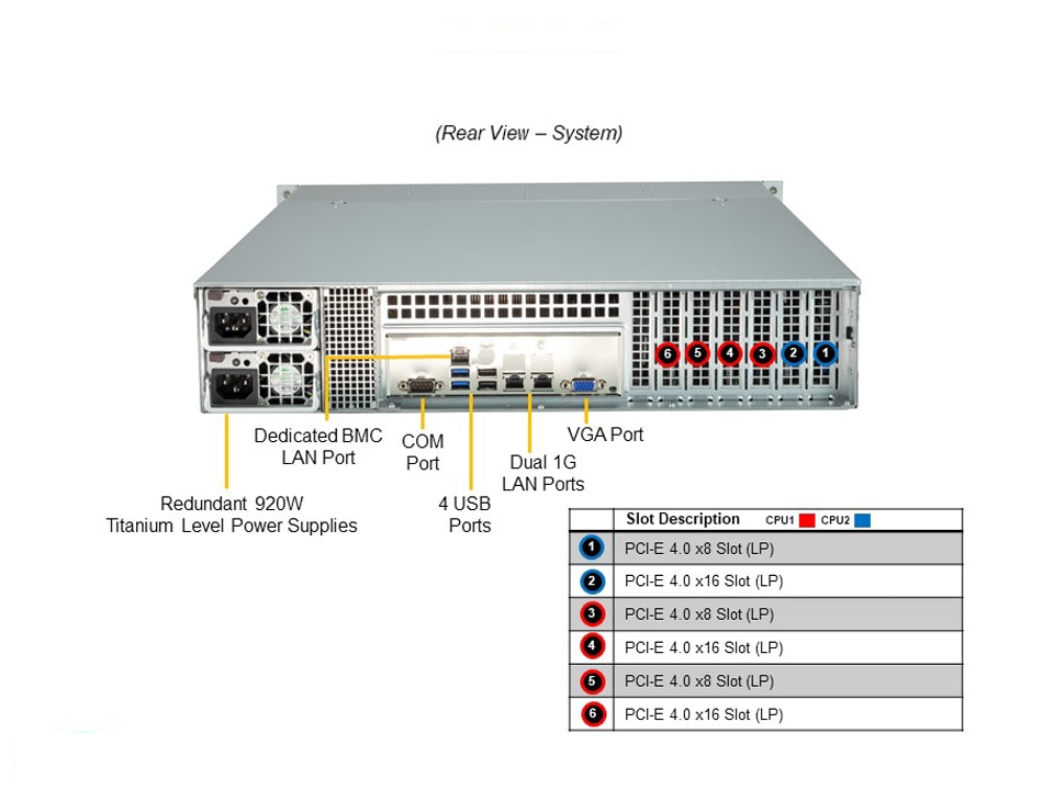 Key Features Virtualization Hyperconverge Storage Cloud Computing High End Enterprise Server Flexible Networking Options 1. Dual AMD EPYC™ 7001/7002* Series Processors (*AMD EPYC 7002 series drop-in support requires board revision 2.x) 2. 4TB Registered ECC DDR4 2666MHz SDRAM in 32 DIMMs (7001 Processors) 8TB Registered ECC DDR4 3200MHz SDRAM in 32 DIMMs (Board revision 2.x required + 7002 Processors) 3. Expansion slots: 1 PCI-E 3.0 x16 slot (FH, 10.5" L) 5 PCI-E 3.0 x8 slots (FH, 9.5" L) 1 PCI-E 3.0 x8 slot (LP) 1 PCI-E 3.0 x8 (internal proprietary LP slot) [ Details ] 4. Integrated IPMI 2.0 + KVM with dedicated LAN • Software Out of Band License key (SFT-OOB-LIC) included for OOB BIOS management 5. Quad Gigabit LAN ports via Intel i350AM4 6. 12 hot-swap 3.5" Drive Bays: 12 SATA3 by default or 8 SATA3 + 4 NVMe (optional supported) or 12 SAS3 (SAS Add-on card is optional) 7. 1600W Redundant Power Supplies Titanium Level (96%+) (Full redundancy based on configuration and application load) |